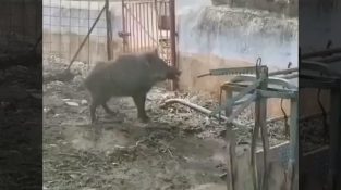 Seorang petani mencoba mengusir babi hutan dari peternakannya sambil berdiri di atap kandang. Babi hutan itu tampaknya sedang menjauh, tapi dia benar-benar memanfaatkan kesempatan itu untuk menyerang balik pria malang itu.