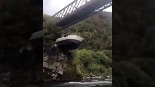 Seorang pria berayun di dalam speedboat, yang digantung dengan tali kawat pada jembatan.