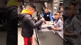 Dua pemuda melakukan trik sulap untuk mencuri salami dari supermarket di Ukraina.