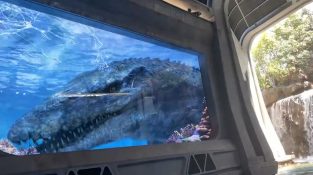 Di taman Universal Studios di Hollywood, bisakah seseorang naik perahu kecil di Jurassic World. Rutenya cukup spektakuler.