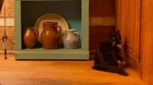 Seekor kucing meminta makanan dari pemiliknya, mengetuk pintu lemari tempat dia menyimpan makanan kucing.