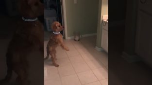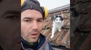 Seorang pria menirukan suara mengeong kucing yang ganas, menangkap reaksi kucing di belakangnya.