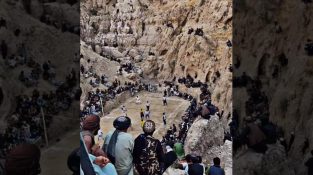 Lapangan voli yang benar-benar unik di provinsi pegunungan Samangan, Afghanistan, yang terletak di antara pegunungan berbatu.