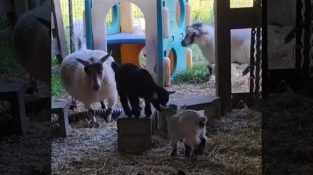 Seekor induk kambing yang tampak kesal mendorong anaknya untuk lewat.