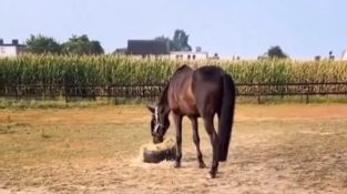 Seekor kuda pergi ke makanannya, dan dikejutkan oleh seekor kucing yang tiba-tiba muncul dari sedotan.
