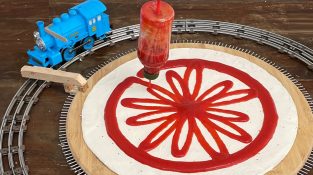 Mesin Rube Goldberg ditenagai oleh kereta listrik kecil, dia menyiapkan pizza. Sebuah video oleh Joseph Herscher.