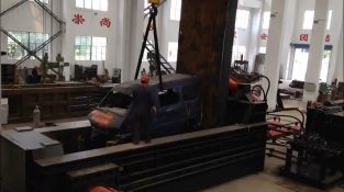 Mesin press hidrolik dari perusahaan Cina Jiangyin Huake Machinery Equipment Co., itu dapat mengembangkan tekanan hingga 400 ton dan memampatkan mobil menjadi kotak yang kompak.