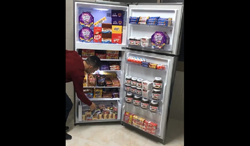 Il Ahmad Hasan Talat mostra un frigorifero pieno di cioccolatini e altri dolci note.
