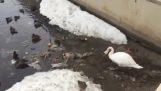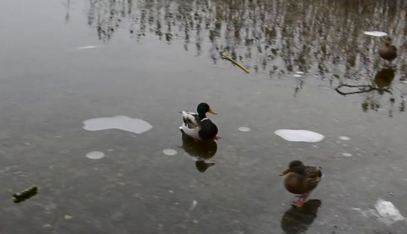 Un'anatra rende un divertente atterraggio sulla superficie ghiacciata di un lago.