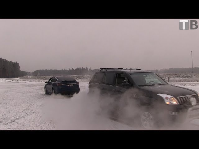 Un braccio di ferro tra un elettrico Tesla Model X e un SUV Toyota Land Cruiser in strada ghiacciata.