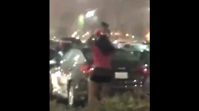 Una donna usa il suo bambino invece di un ombrello sotto la pioggia. Nominato per peggior madre dell'anno.
