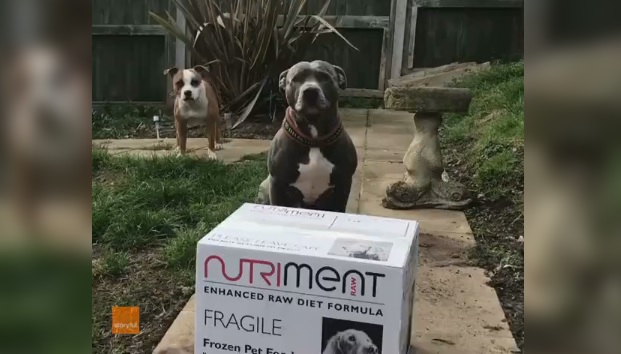 In provincia di Surrey, Regno Unito, un cane si apre la scatola con il cibo per cani che è appena arrivato per posta.