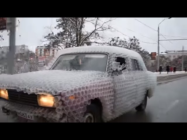 Un auto coperto con bicchieri di plastica a Briansk, Russia