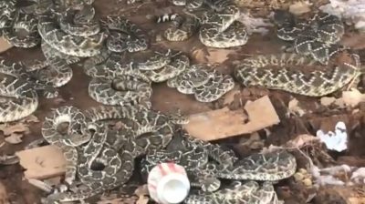 Negli Stati Uniti, Texas, un contadino notò un serpente nascosto in una vecchia baita e si intrufola a terra. Usando un carrello elevatore, Lei ha deciso di aumentare la capanna per rivelare un grande nido serpente.
