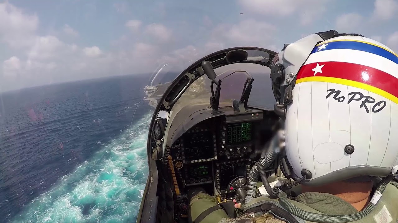 L'atterraggio di un aereo da caccia Boeing F / A-18F Super Hornet a bordo degli aerei. immagini impressionanti dalla cabina di guida.