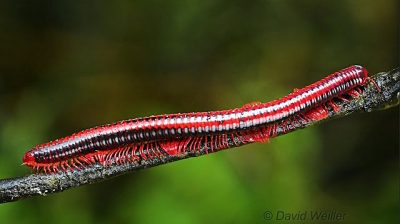 Un millepiedi piuttosto rosso cammina su un ramo.