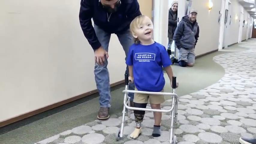L'olimpionico Blake Leeper, incoraggia un bambino di 2 anni a provare a camminare con una protesi alla gamba per la prima volta.