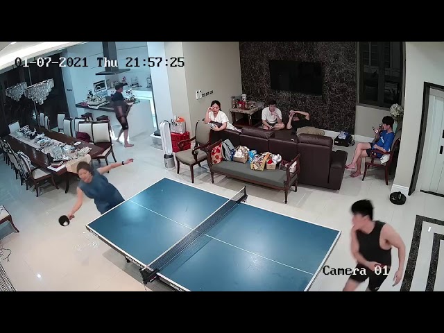 Durante una partita a ping pong con la famiglia, un uomo lascia cadere la racchetta che poi colpisce violentemente il volto della sorella, tranquillamente seduto su un divano a guardare la partita.