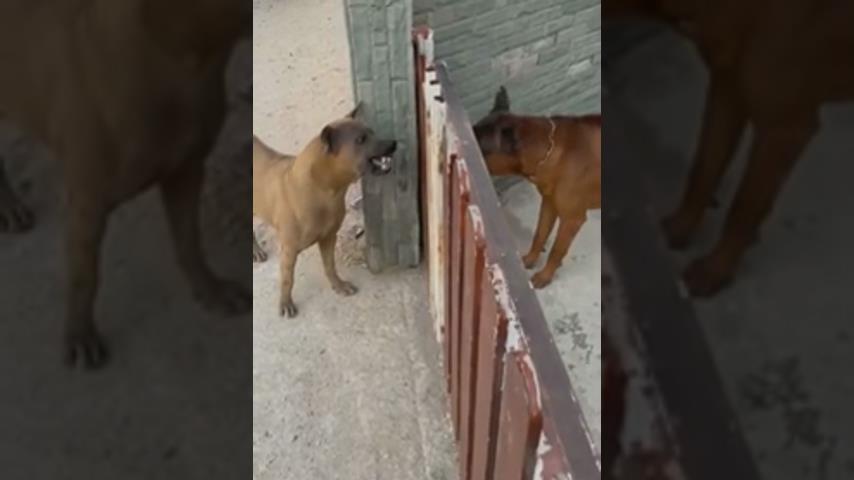 Due cani assetati di sangue sono faccia a faccia, separati solo dalle ringhiere di un cancello.
