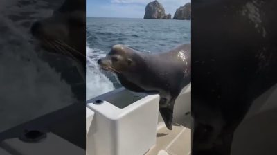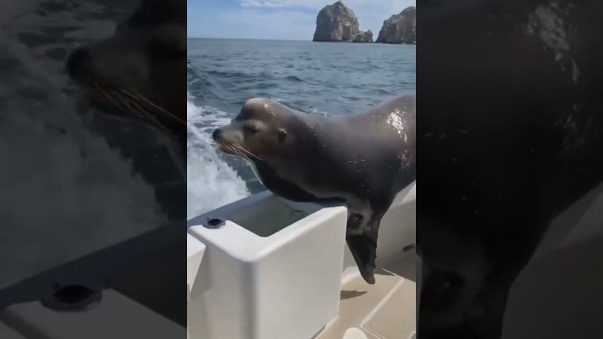 Accompagnato da pellicani, una foca salta su un peschereccio e sa esattamente dove guardare.