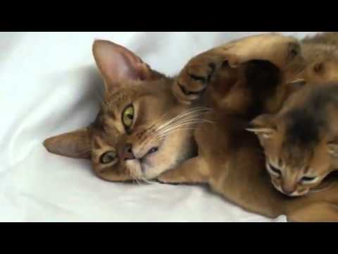 Un gatto Abissinia in un momento molto tenero con i suoi cuccioli