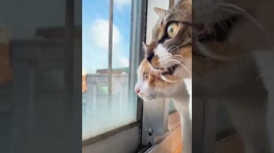 Due gatti spettegolanti che parlano, mentre osservano gli uccelli del vicinato davanti a una finestra.
