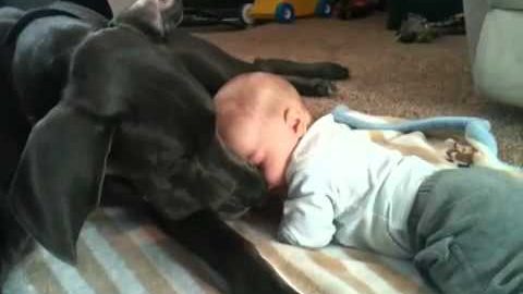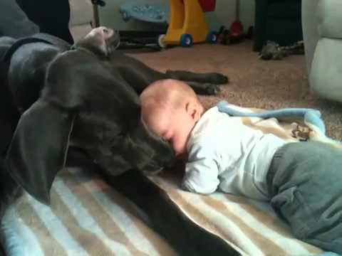 Un cane di razza 'alano' cercando di abbracciare il nuovo membro della famiglia.