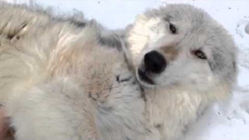 Il lupo di nome ale gode di alcune accarezza nel ventre, in un santuario di Wolf in US Intacho.