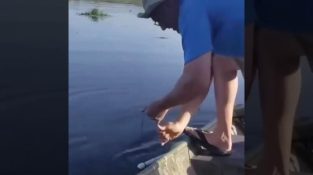 Un pescatore pensava di aver catturato un grosso pesce gatto, e lui e sua moglie volevano registrare il pesce grosso in video. Infine, un grande alligatore emerge dalla sua linea.