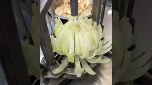 Una cipolla viene tagliata come un fiore e fritta in olio bollente.