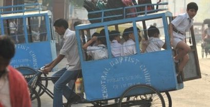 Bambini in India strimochnwntai in questi improvvisati scuolabus, fatto da una gabbia attaccata alla bici. Queste biciclette trasportano fino a 10 bambini nelle scuole della capitale di Nuova Delhi.