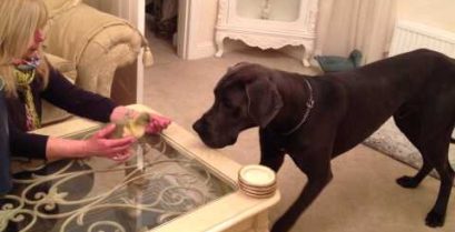 La Hugo, un alano di 14 mesi sa Darcy, una 4 giorni d'oca neonato.