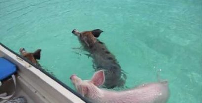 Tre maiali sguazzando che cercano un po ' cibo da turisti su un'isola delle Bahamas.