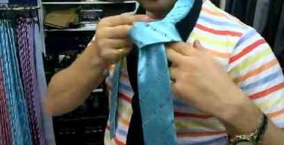 Proprietario del negozio di abbigliamento in Iran, spiegare a un cliente come legare una cravatta molto rapidamente.
