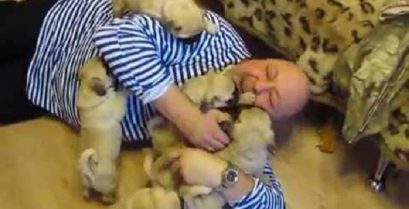 Un uomo in Serbia saluta i suoi 6 cuccioli felici.