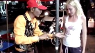 In città via Pattaya in Thailandia, un giocoliere ci fa una demo di alcuni seni improbabili con sigarette.
