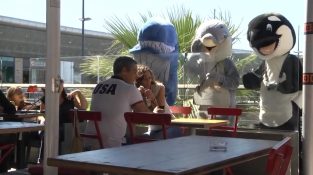 “Human World” è un parco a tema specializzato nello studio e nello sfruttamento degli esseri umani. Remi Gaillard vestito delfino e insieme ai suoi amici ammirato la gente dietro il vetro.