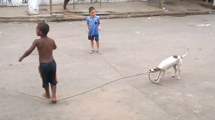 In una favela in Brasile, un cane aiuta un gruppo di bambini piccoli per giocare corda.