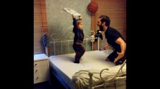 Un padre gioca in un letto con il suo figlio di due anni. Due di loro imitare i movimenti tipici di combattenti in incontri della WWE di wrestling.