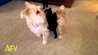Un gattino cercando di giocare arrampicata sul retro di un cane, che non sembra essere godendo.