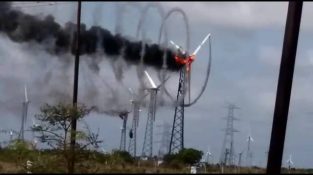 In un parco eolico vicino a Coimbatore India, una turbina eolica ha preso fuoco a causa di un corto circuito. Durante la rotazione, una delle lame di una spirale enorme di fumo prima alla fine si dissolve l'intera elica.