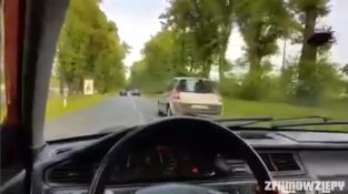 Un incidente insolito in strada in Polonia, come pilota cercando di fare un grande sorpasso. Il cofano della macchina aperto, bloccando la visibilità. Fortunatamente, c'è stato un incidente.
