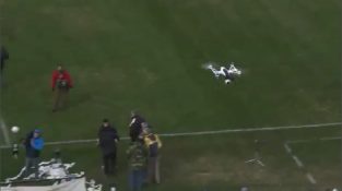 In uno stadio di calcio in Argentina, una ventola rompe un drone stazione TV utilizzando un rotolo di carta igienica.
