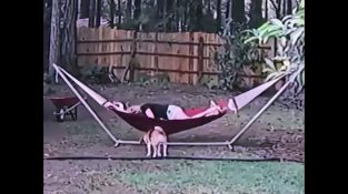 Mentre i boss sono su un'amaca, un beagle cerca di giacere con loro.
