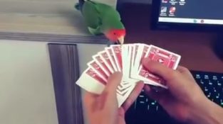 Mago facendo un trucco su ponte, con l'aiuto di un piccolo pappagallo.