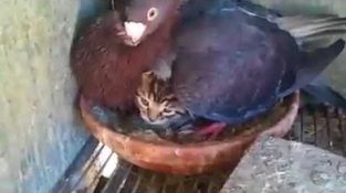 Un piccione guarda un piccolo gattino sdraiato nel nido, e non lascia più vicino alla.