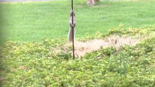Uno scoiattolo cerca di salire su una mangiatoia per uccelli e mangiare semi, ma per questo motivo i proprietari hanno messo dell'olio nella base della mangiatoia. Così lo scoiattolo scivola ogni volta, [...]