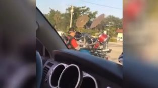 In un motociclo appositamente costruito, un uomo che suona la batteria durante l'attesa lanterna rossa. La traccia è 'Beat It' di Michael Jackson.
