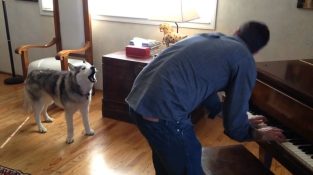 A canzoni husky come il suo capo suona una melodia al pianoforte.