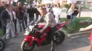 Un motociclista poco esperto tenta di fare una 'dimostrazione' di burnout sulla sua moto. Fallirà miseramente, ma ci darà una scena divertente.